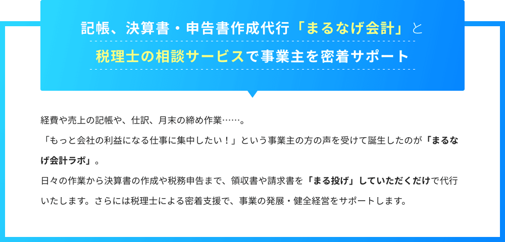 記帳、決算書・申告書作成代行「まるなげ会計」と税理士の相談サービスで事業主を密着サポート